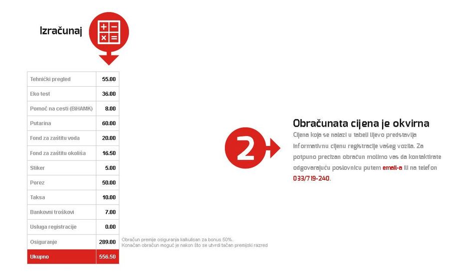 Autocentar BH.ba na svojoj stranici pruža mogućnost provjere okvirne cijene plaćanja kompletne registracije vozila, a mi smo za primjer uzeli automobili Volkswagen Golf VI 1.6 TDI 77 KW. Izabrali smo stanicu tehničkog pregleda u Sarajevu, da produžujemo registraciju, snaga motora da je od 71 kW – 84 kW, dizel, 2011 godište, zapremina u ccm 1598, te da je plaćanje gotovinsko.